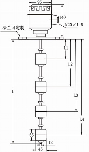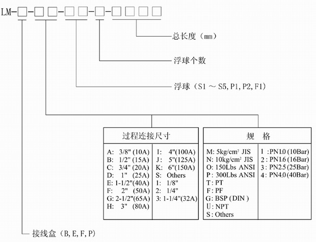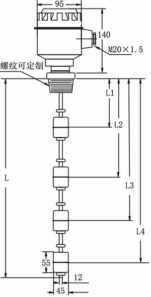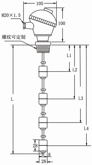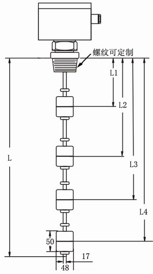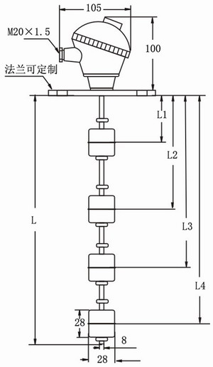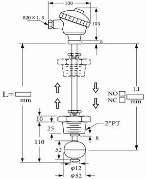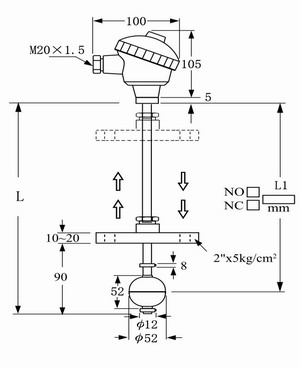 连杆浮球液位开关与小型浮球液位开关原理基本相同,通常将密封的非磁性金属或塑胶管内根据需要设置一点或多点磁簧开关,再将中空而内部有环形磁铁的的浮球固定在杆径内磁簧开关相关位置上,使浮球在一定范围内上下浮动,利用浮球内的磁铁去吸引磁簧开关的闭合,产生开关动作,以控制液位。常开和常闭是没有注入液体时的状态。 连杆浮球液位开关为定制品,依照被测液体的温度、压力、比重、耐酸碱等特性,选择适合规格的浮球。选购时还需确定接续规格(法兰安装或螺纹安装等),各动作点位置,动作形式(常开或常闭)和总长。