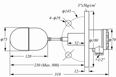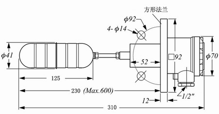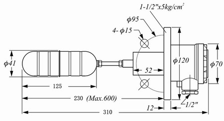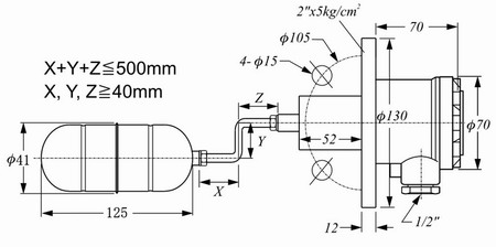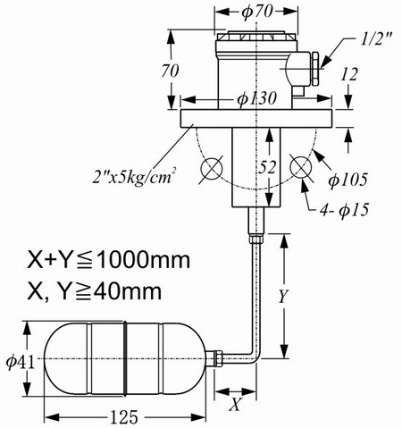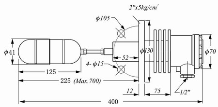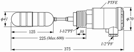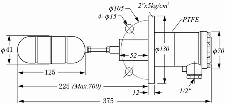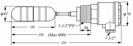 侧装式浮球开关是利用液体浮力原理,当浮球因浮力作用而上下运动时,接线盒内的磁簧开关(或微动开关)受到臂端磁铁影响,而作"NC"接点与"NO"接点之互换。浮球有 φ40, φ44,φ50, φ75四种规格浮球,塑料材质有 PP、PVDF,可用于酸碱场所,SUS 304/316L材质适用于高温或高压桶槽,侧装、上装皆可安装,接线盒防护等级为 IP-65,接续法兰有 JIS, DIN及 ANSI等规格;牙口有 1-1/2, 2"PT, BSP或客户指定规格,耐压最高可达 50kg/cm2,耐温最高可达350℃,适用比重为 0.25~0.65g/cm3 。